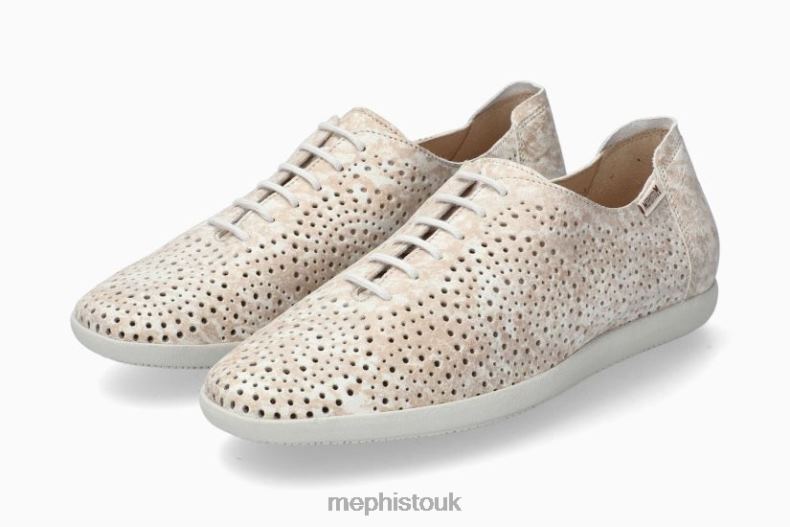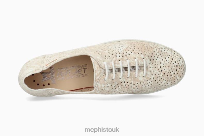 This finely perforated shoe adapts to any style and to all your needs! The detachable insole with integrated SOFT-AIR Technology reduces impact to a minimum, for a gentle, effortless walk. This lace-up shoe ensures optimum comfort and an excellent fit. The leather lining ensures a healthy climate inside. MEPHISTO KATIE SUN | Women Shoes Beige Leather Metallic Cracked