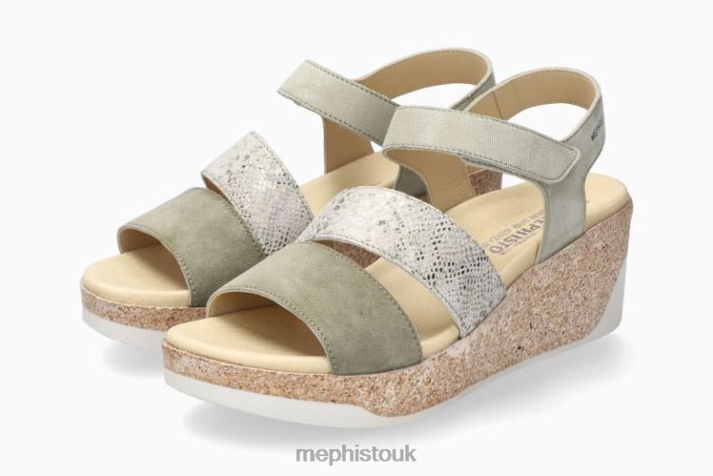 Feminine and fashionable, this wedge heel sandal is a summer essential. Enjoy unparalleled comfort, thanks to the SHOCK-ABSORBER in the outsole and its SOFT-AIR cork foot-bed, which help to reduce impact from walking. The adjustable adhesive strap ensures perfect adjustment and comfort. Its lining, in real leather and textile, guarantees superior quality and comfort. MEPHISTO GIANNA | Women Sandals Green Leather Metallic Fancy Print