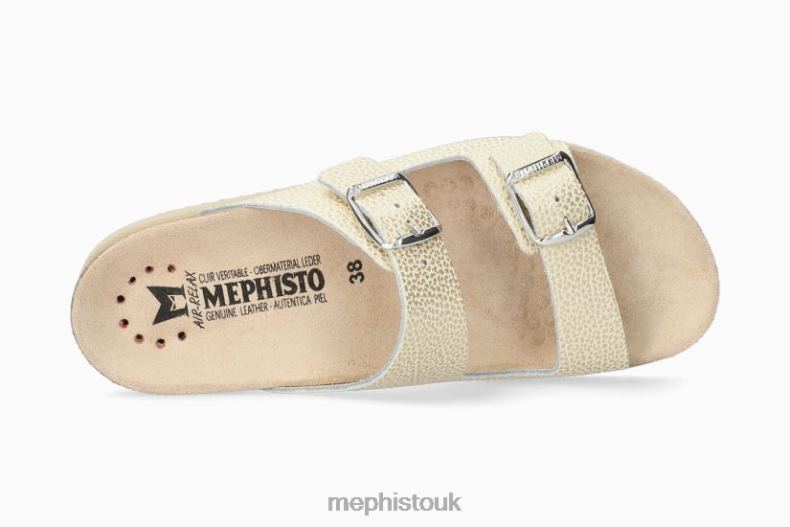 MEPHISTO HARMONY | Women Cork Sandals Beige Leather Metallic Grainy. This lightweight ladies' mule is a must for a relaxed summer. The unique SOFT-AIR technology, integrated in the cork midsole, guarantees an effortless walk. The AIR-RELAX technology respects the anatomy of the foot to prevent fallen arches. Adjustable straps with buckle fastening.