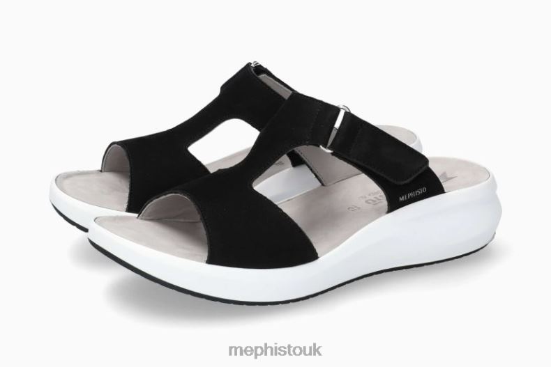MEPHISTO TEENY | Women Sandals Black Leather Nubuck. With its sporty, relaxed look, this mule guarantees unparalleled comfort. The SOFT-AIR midsole and the SHOCK-ABSORBER, integrated in the outsole, minimise impact for an effortless walk with a spring in your step. The AIR-RELAX technology respects the anatomy of the foot to prevent fallen arches. The adjustable adhesive strap across the instep guarantees an excellent fit. Its real leather lining guarantees superior quality and comfort.