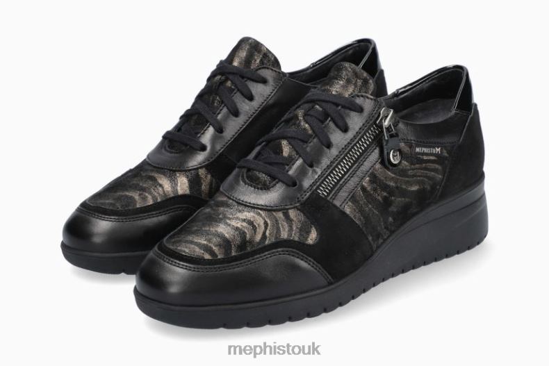 MEPHISTO IASMINA | Women Sneaker Black Leather Metallic Zebra Print. This lightweight shoe, with its sporty look, will win you over with its unparalleled comfort. The detachable insole, with integrated SOFT-AIR Technology, and the SHOCK-ABSORBER, in the outsole, minimise impact for an effortless walk with a spring in your step. The AIR-RELAX technology respects the anatomy of the foot to prevent fallen arches. In addition to the lacing, a side zip fastening allows you to slip into the shoe with effortless ease. The leather lining ensures good foot hygiene.